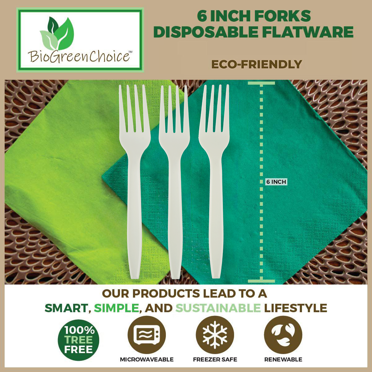 STURDY FORKS: BioGreenChoice 6 inch Eco-Friendly forks are extremely durable and looks more elegant compared to plastic fork and plastic utensils. Our heavy duty forks are strong and withstands more stress with ease. Our premium white forks comes in 20 elegant packs containing 24 forks each (480 CT) offering ease of use.
