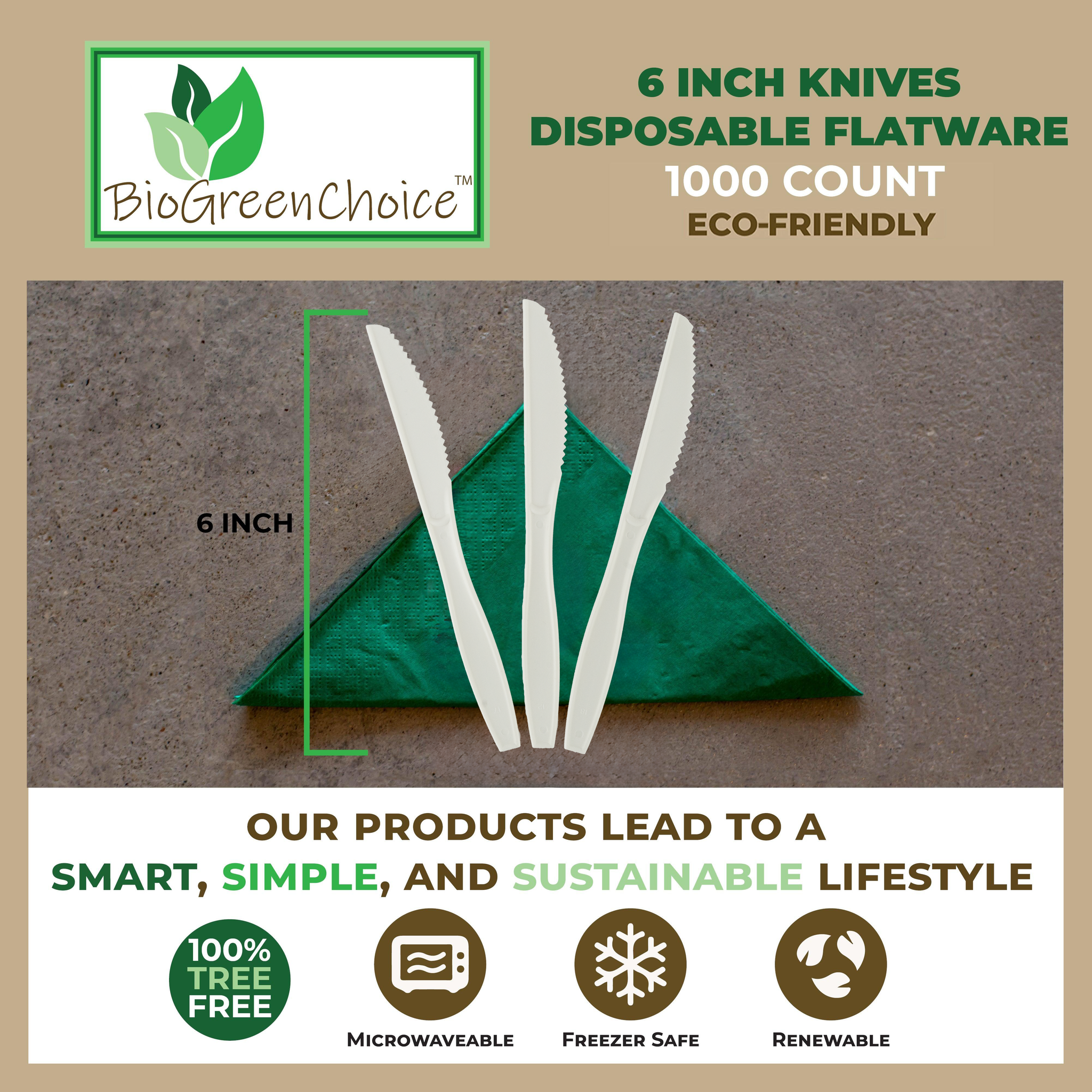 PLANT BASED: Our 6-inch Eco-Friendly Cutlery Knives (pack size of 1000) are made from CPLA ( crystalized polylactic acid ) derived from renewable and sustainable cornstarch. Our Cornstarch knives are strong, durable and green alternative to plastic knives and utensils.